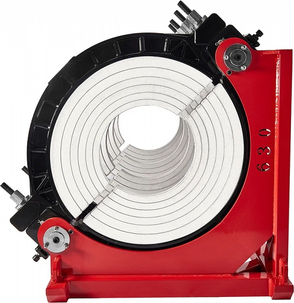 - Центраторо с гидравлическим приводом и 4-мя прочными широкими зажимами, один из которых легко может быть удален для облегчения сварки полимерных фитингов с трубами (тройники, крестовины, отводы), имеет большой запас прочности за счет качественного сплава и ребер жесткости, что позволяет сваривать полимерные трубы с любым показателем SDR