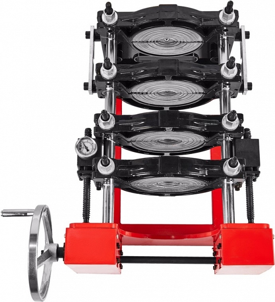 - Центратор с 4-мя откидными зажимами, редуктором и манометром имеет большой запас прочности за счет качественного сплава и ребер жесткости, что позволяет сваривать полимерные трубы с любым показателем SDR