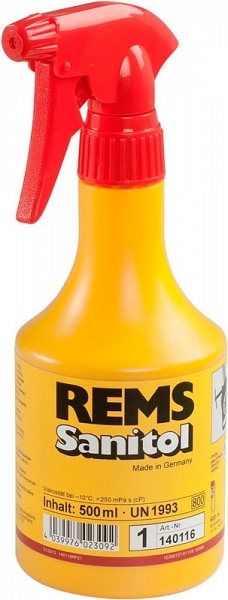 Синтетическая смазка для нарезания резьбы Rems Sanitol 500 мл (Ремс Санитоль 500 мл) без минеральных масел специально разработана для трубопроводов питьевой воды, великолепно подходит для нарезки обычной резьбы, а также в качестве смазывающе-охлаждающей жидкости при пилении металлов и универсального использования.
